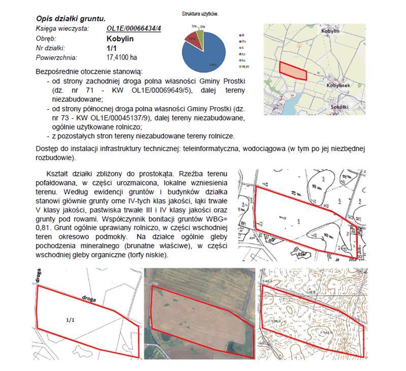 Przedmiotem licytacji jest nieruchomość gruntowa niezabudowana, położona w woj. warmińsko-mazurskim, powiecie ełckim, na terenie gminy Prostki, obrębie Kobylin, dla której Sąd Rejonowy w Ełku prowadzi księgę wieczystą nr KW OL1E/00066434/4, w zakresie prawa własności działki gruntu nr 1/1 o pow. 17,4100.