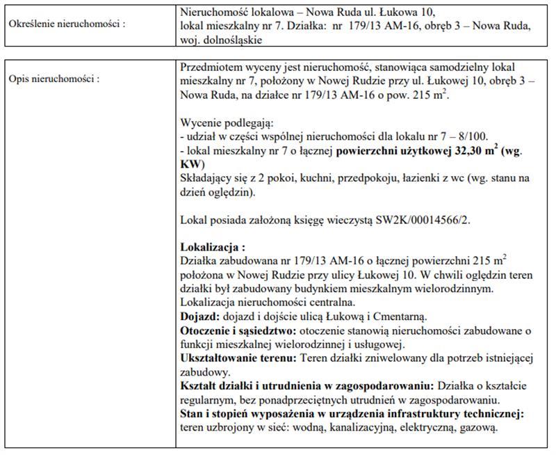 Nieruchomość stanowiąca samodzielny lokal mieszkalny nr 7 o powierzchni użytkowej 32,30 m2 składający się z 2 pokoi, kuchni, przedpokoju, łazienki z wc , położony na III kondygnacji w Nowej Rudzie przy ul. Łukowej 10, obręb 3 - Nowa Ruda, na działce nr 179/13 AM-16 o powierzchni 215 m2.