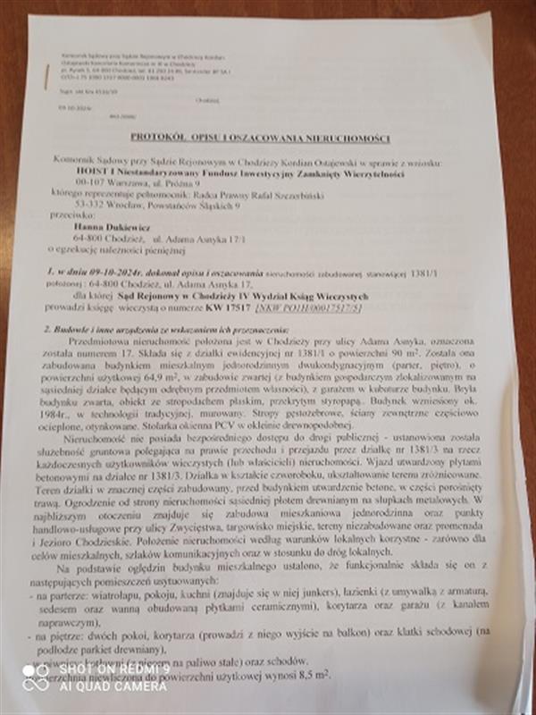 - nieruchomości położonej przy Asnyka 17, 64-800 Chodzież, dla której Sąd Rejonowy w Chodzieży IV Wydział Ksiąg Wieczystych (adres: ul. Krasińskiego 10, Chodzież, 64-800 Chodzież) prowadzi księgę wieczystą o numerze PO1H/00017517/5.