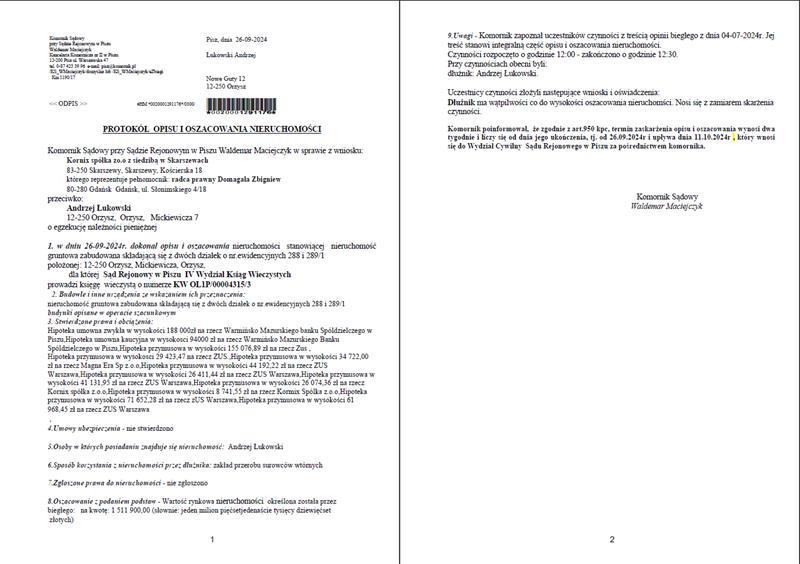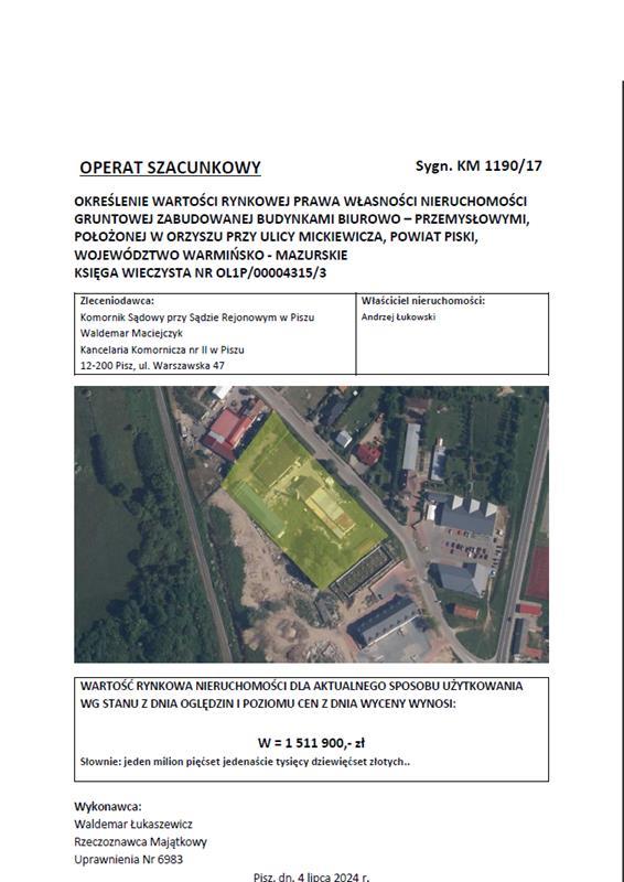 - nieruchomości położonej przy Mickiewicza 0/0, 12-250 Orzysz, dla której Sąd Rejonowy w Piszu IV Wydział Ksiąg Wieczystych (adres: ul. Warszawska 47, Pisz, 12-200 Pisz) prowadzi księgę wieczystą o numerze OL1P/00004315/3.