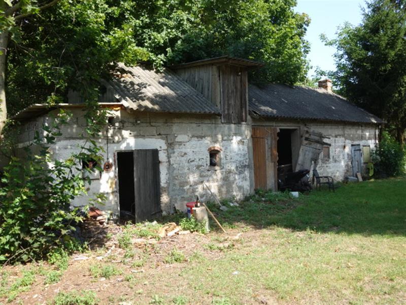 2. budynek gospodarczy w złym stanie technicznym z roku 1950, o pow. zab. 77,00 m2 , jednokondygnacyjny. Budynek murowany metodą tradycyjną z pustaka żużlowego, dach o konstrukcji drewnianej dwuspadowy pokryty eternitem, okna PCV, wrota i drzwi z desek z dużymi ubytkami, Elewacja- pozostałość po tynku cementowo-wapiennym.